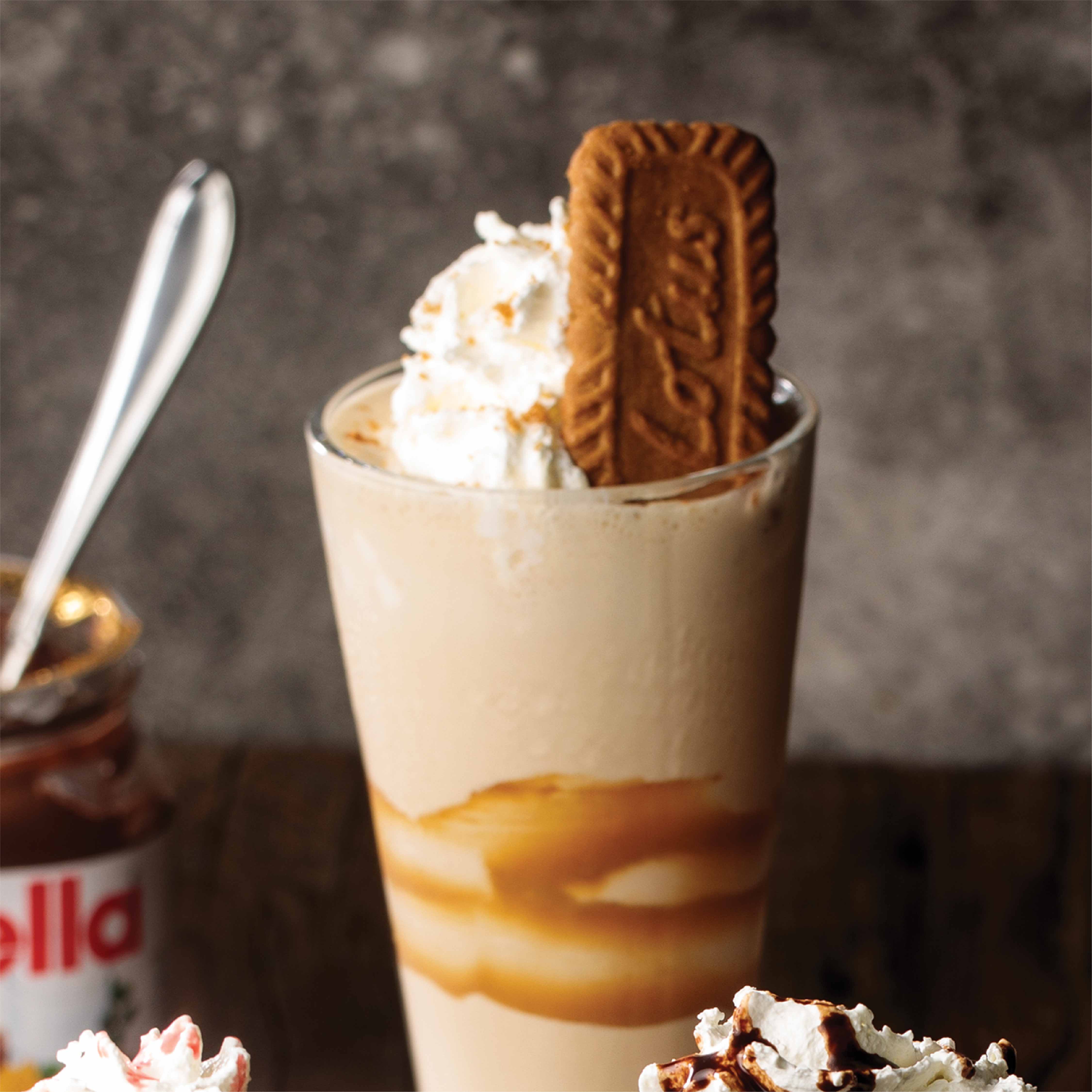 Lotus crumble shake with ice cream and milk garnish with cream, lotus powder and biscuit.