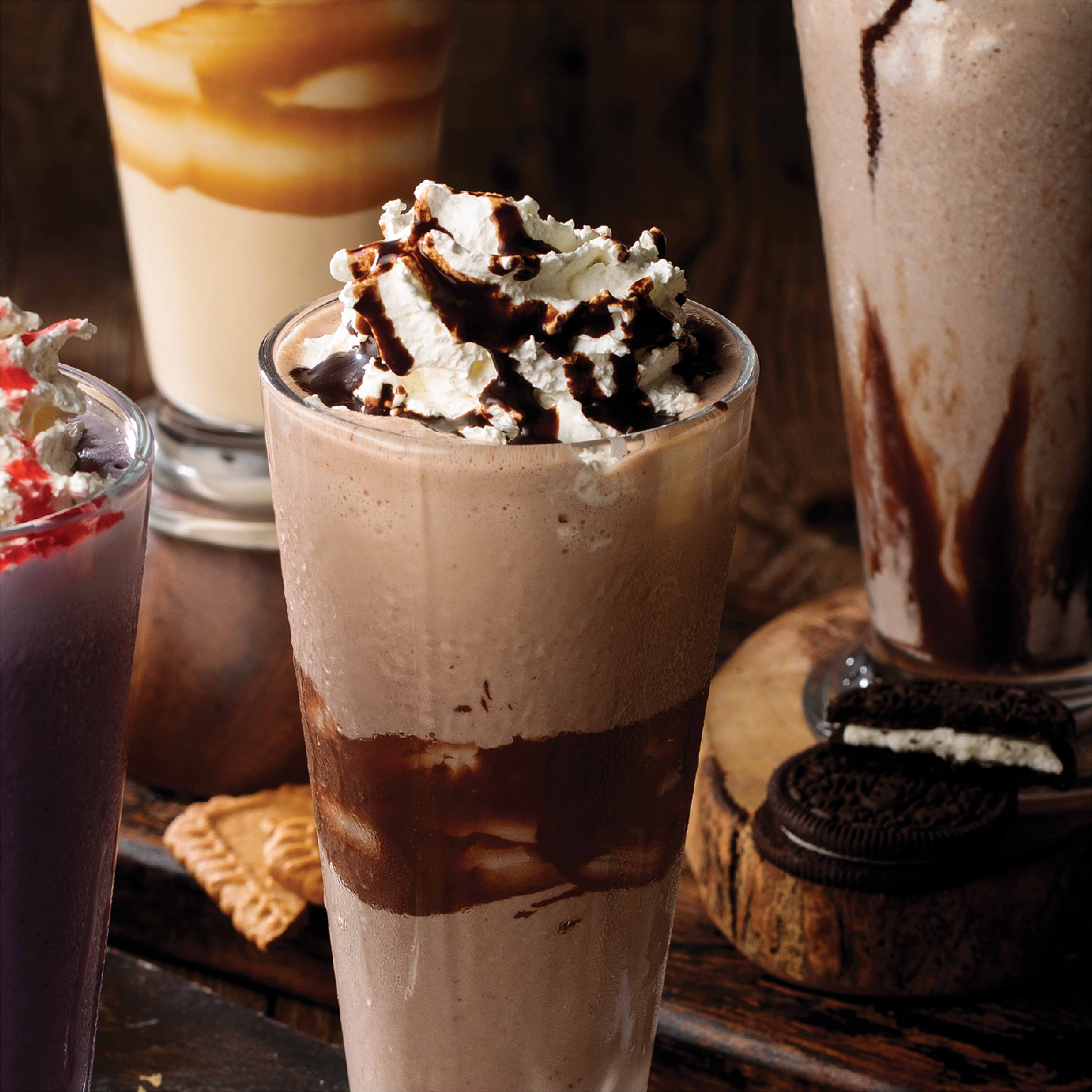 Oreo crumble shake with milk and ice cream, garnish with cream and chocolate sauce.