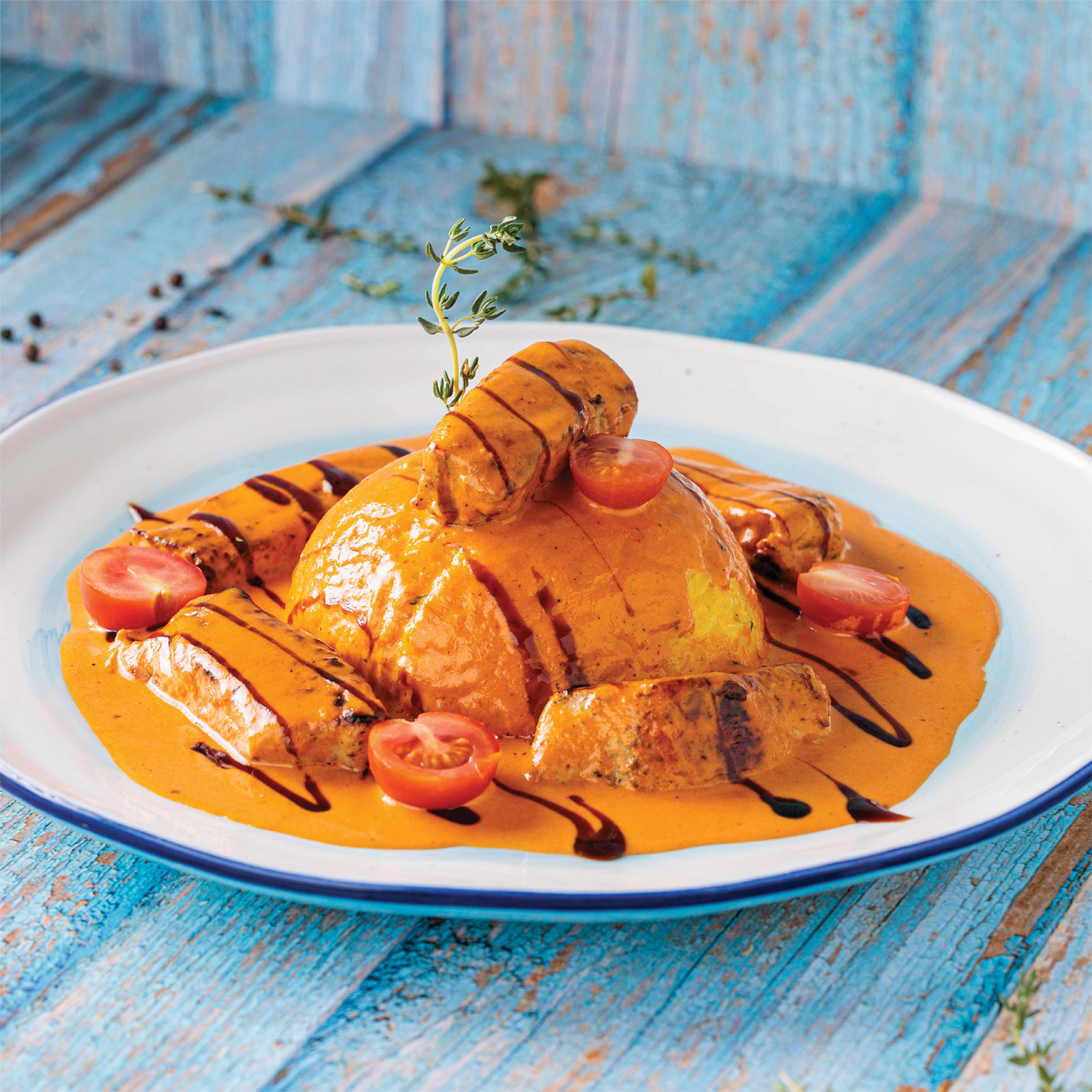 Chicken, cream paprika sauce, mushroom, bell pepper, gherkins and serve with mashed potato or arabic rice.